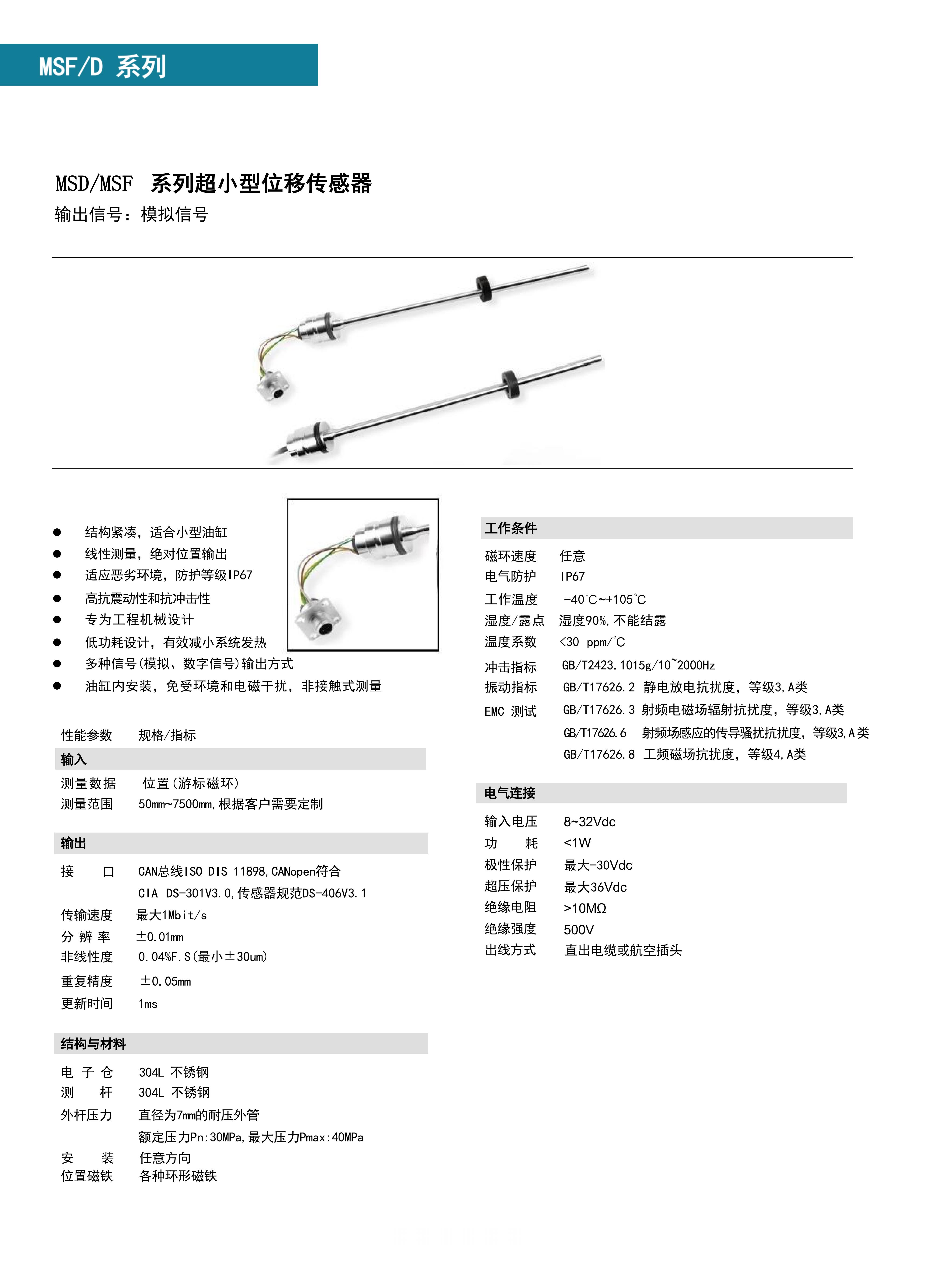 博尔森MSD/MSF系列是行走机械专属的小型化磁致伸缩位移传感器,可替代电位计等接触式产品,测量量程达7500mm,耐350bar高压、防护等级IP69K,抗冲击振动与电磁干扰,不受恶劣介质影响。支持模拟量(VDC/mA)及CANopen、SAE J1939总线输出,适配12/24VDC通用供电,安装便捷且非接触无磨损,核心适配农业/建筑机械的液压转向、油缸等系统,是进口传感器的高性价比替代方案。