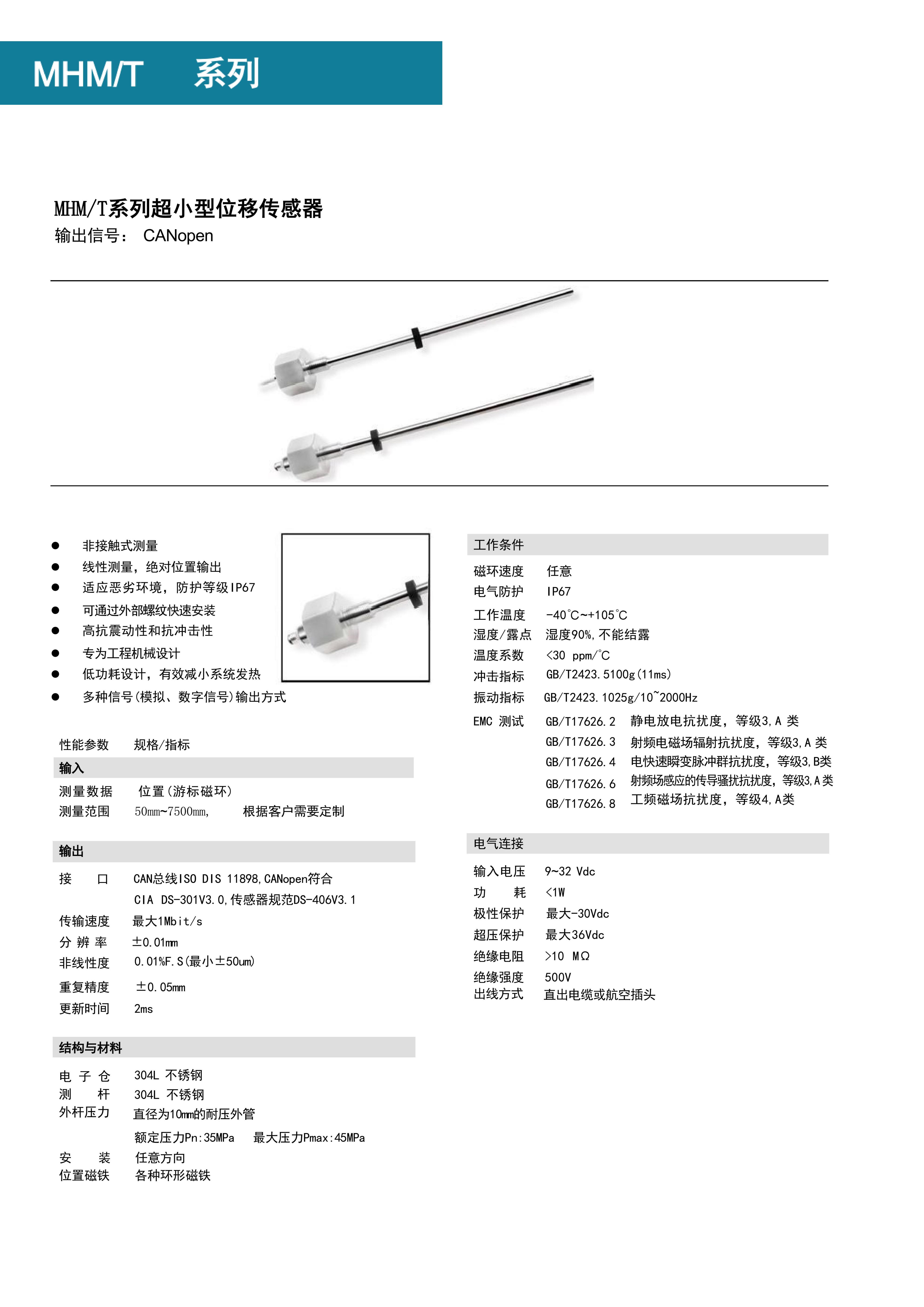 博尔森MHM/MHT系列是专为液压油缸内置行程测量设计的螺纹式模拟量磁致伸缩位移传感器,带M18x1.5螺纹,耐压外管可选7mm/10mm,测量行程达7500mm。